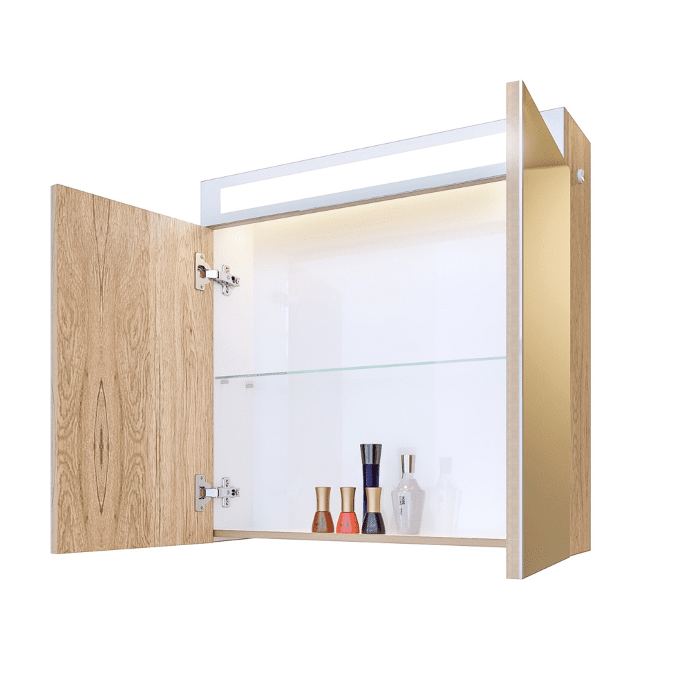 Този горен шкаф за баня ОРЕГОН е перфектното допълнение за всяка модерна баня. Със своето изчистено оформление и функционалност, този горен шкаф предлага стилно решение за съхранение. Вграденият огледален панел и LED осветлението осигуряват отлично осветление, което ще подчертае красотата на вашата баня.