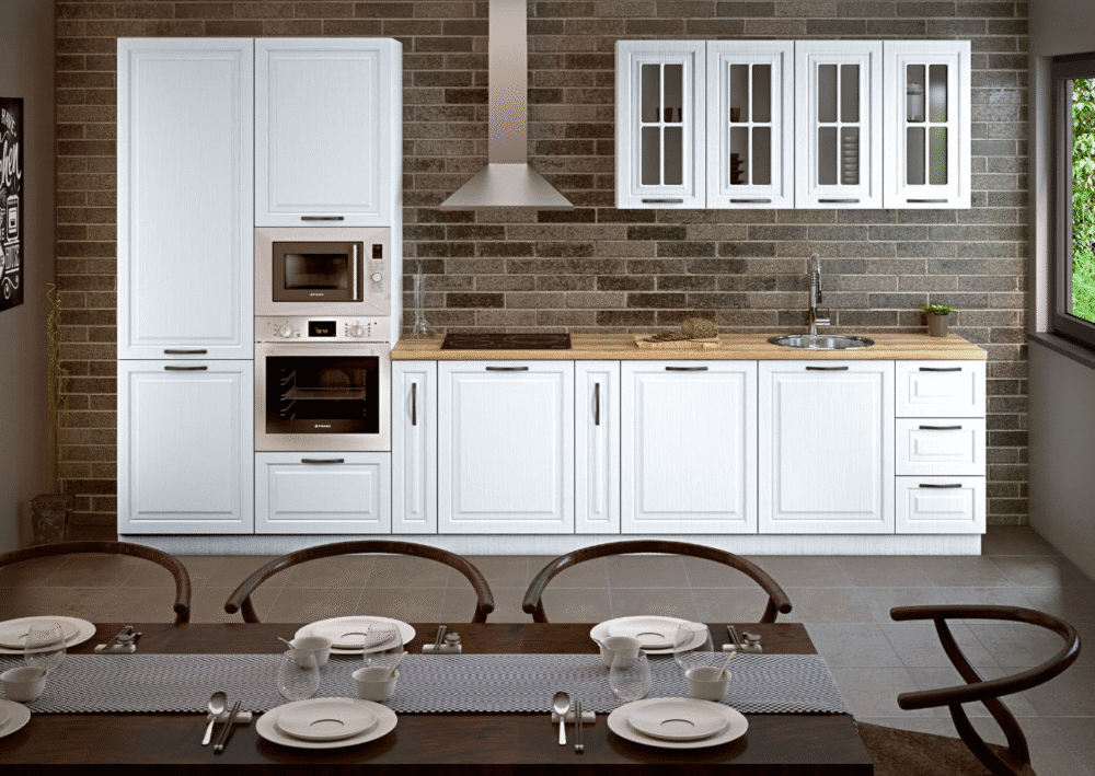 Със своя изчистен дизайн и бял корпус, кухнята лесно се вписва в различни интериори, а термоплотът в цвят светъл дъб добавя топлина и стил. Тя предлага практично решение, съчетавайки елегантност и функционалност за съвременния дом.